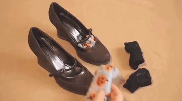 然后把袜子放到鞋里,直到鞋子完全被塞满,一晚之后鞋子就会变大啦。