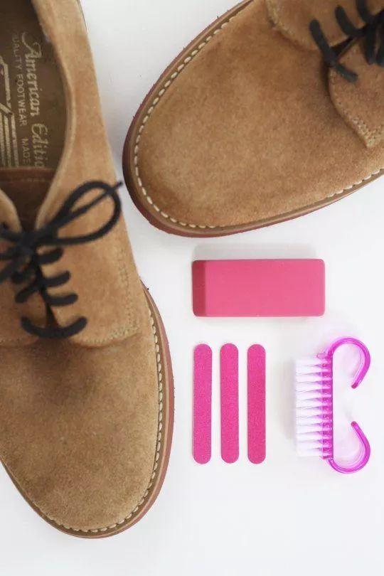 麂皮鞋上大多数的污渍可以用橡皮擦、牙刷和美甲用的抛光锉就能解决~用这些工具顺着一个方向轻轻摩擦污渍就能去除,千万别太用力哦,谨慎鞋面变秃就不美了。