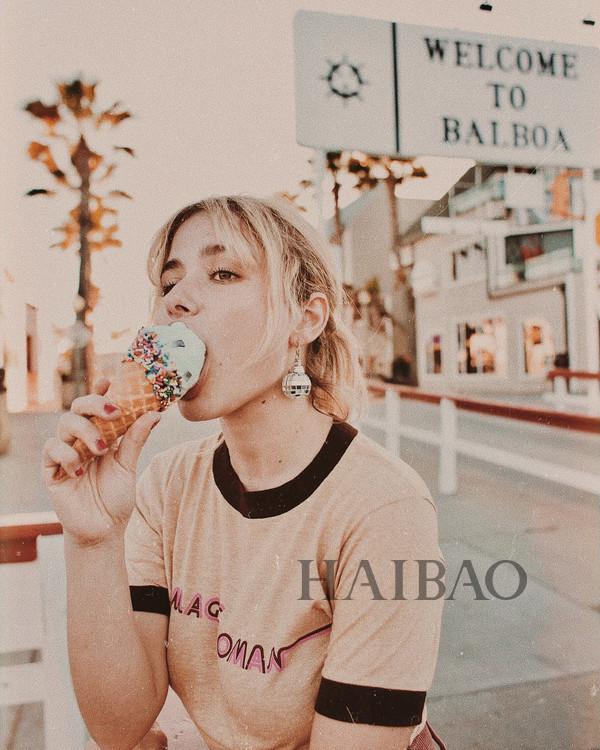 夏天衣橱里必不可少的就是T恤了,简简单单的搭配就能打造夏日甜心女孩。Slogan Tee是每年必Buy,淡淡浅粉色搭配Disco风格的夸张耳饰,街头小女生的风格。虽然不是传统意义上的“瘦子”,但是Morgan也不拒绝冰激凌这种高热量甜品,毕竟夏天就是冰激凌的季节呀。
