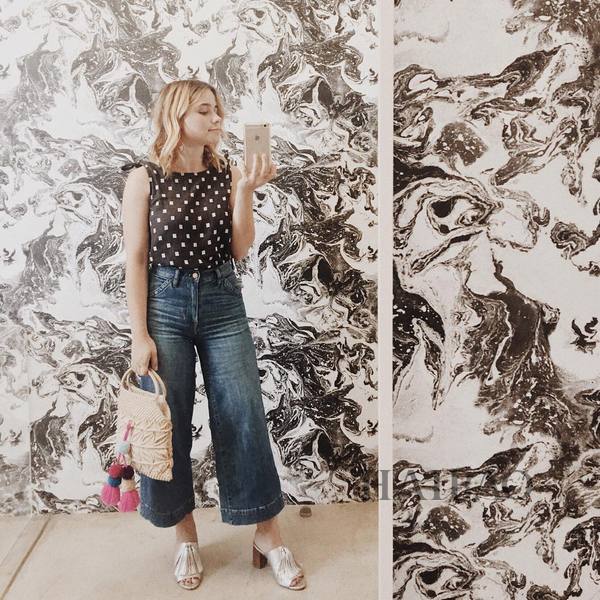 牛仔阔腿裤最百搭,遮肉显瘦气场全开,搭配波点上衣,很有复古的Feel。