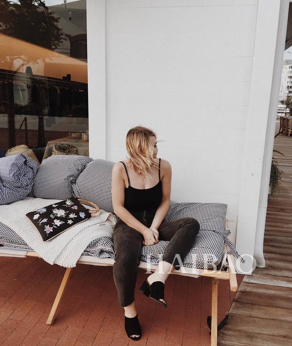 黑色吊带最百搭,搭配同色牛仔裤还有显瘦额功能哦。戴上一顶报童帽也是活力满满。