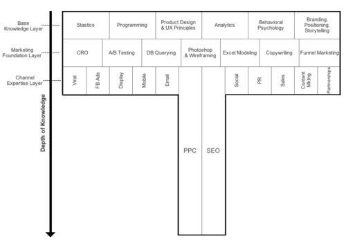 那些从事营销或增长领域工作的人才,对 PPC、SEO 和病毒式营销等收购渠道有着深入了解,同时对于像统计、编程、设计原理和文案等其它领域也有着广泛的了解。