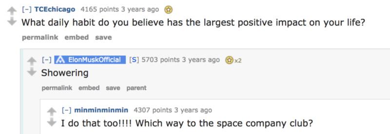 除此之外,对于马斯克来说,淋浴或许也是他的秘诀之一。在 2015 年 Reddit AMA(Ask Me Anything)问答中,马斯克曾回答过这样一个问题:“你认为在你的日常习惯之中,哪一个习惯对你的生活有着最大的积极影响?”马斯克回答道:“淋浴。”在另外一次采访过程中,马斯克也提到他经常在淋浴过程中想到一些好的主意和点子:“这听上去像是老生常谈,但确实是这样。这一想法其实早就存在于你的潜意识之中,并不是真的在早起淋浴过程中产生的,但淋浴能让你快速提取出这一想法。”