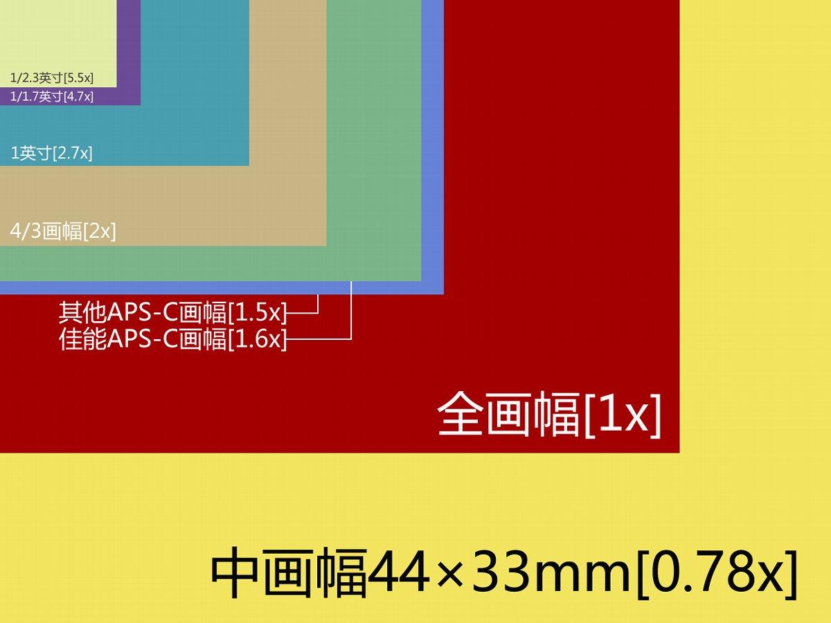 有意思的是,在新的宣传文案中富士将GFX系列称之为“超级全画幅”,而不是“中画幅”,显然很多消费者并不了解中画幅传感器的尺寸其实比全画幅更大,厂方不得已只能玩一把文字游戏了。鉴于这种44×33mm的中画幅传感器已经进入民用市场,我们自然有必要对[可换镜头数码相机画幅尺寸比例示意图]进行重绘,将中画幅传感器的信息补充进去。