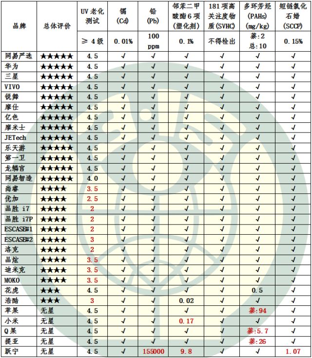 试验结合消费者实际使用场景,参考欧盟的REACH法规、持久性有机污染物指令(POPs)等相关标准,对消费者关心的化学安全问题进行测试。此外,鉴于消费者在使用手机壳的过程中,常常会遇到发黄变色的问题。因此,本次比较试验还采用ISO 4892-3标准对样品进行老化测试,检验样品是否容易发黄变色。