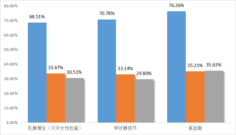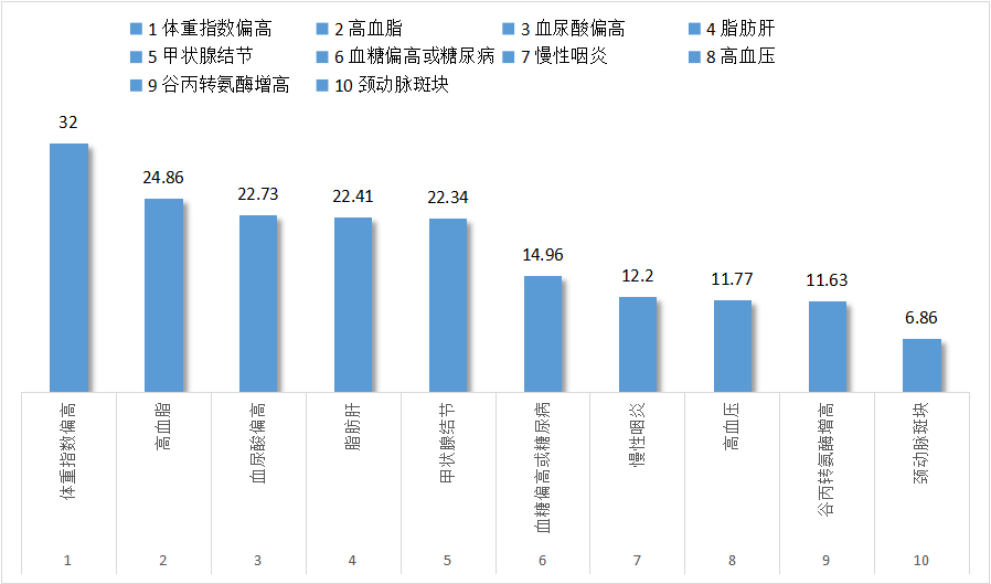 近日,余杭区保健办对2017年区属医院健康体检数据进行了分析。以2017年部分参加体检的14400人为样本,其中男女比例约为1:1。检查出与往年不同的是,2017年检出率最高的前三位疾病分别为:体重指数偏高、高脂血症、血尿酸偏高。