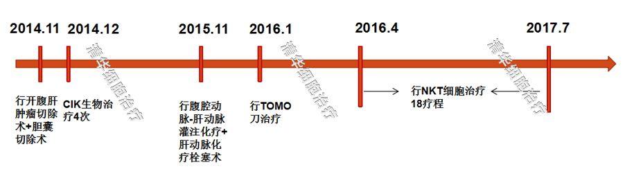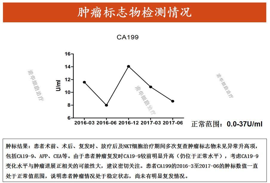 2016年4月,采用NKT细胞免疫治疗,初始治疗方案为1疗程/月,6月改为加强方案治疗,9月改为4+4方案治疗,至今已完成18个疗程(截止2017年7月)。