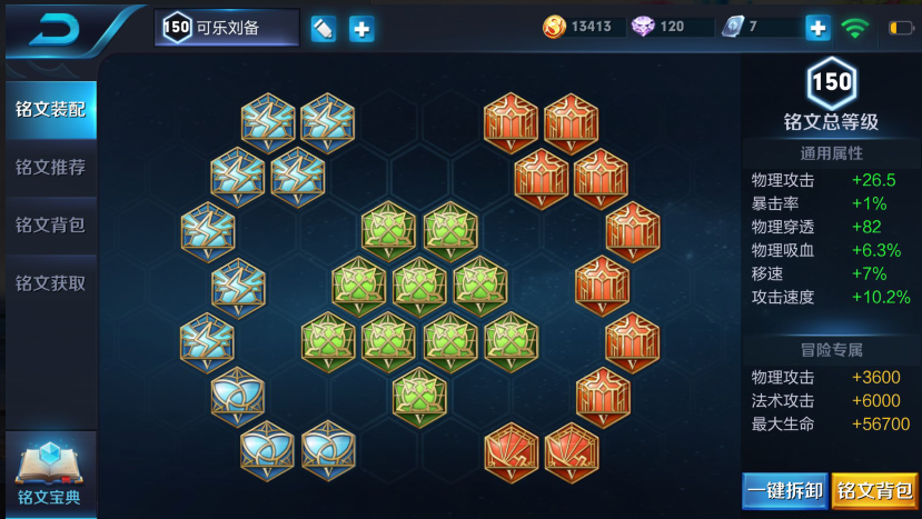 小结:铭文的搭配因人而异(S11版本的时候红色打野刀是提供攻速的,到了S12版本打野刀的改动,红色打野刀不再提供攻速,可乐在赛季初的时候使用刘备总感觉打人的感觉不太对劲,通过几次铭文的调试我摸索出了第五套铭文搭配),刘备铭文的搭配离不开三个要点:吸血、移速、穿透,想学习刘备的看官们可以在以上基础上稍加改动,摸索出自己用起来最舒服的那一套就行了,毕竟适合自己的才是最好的。