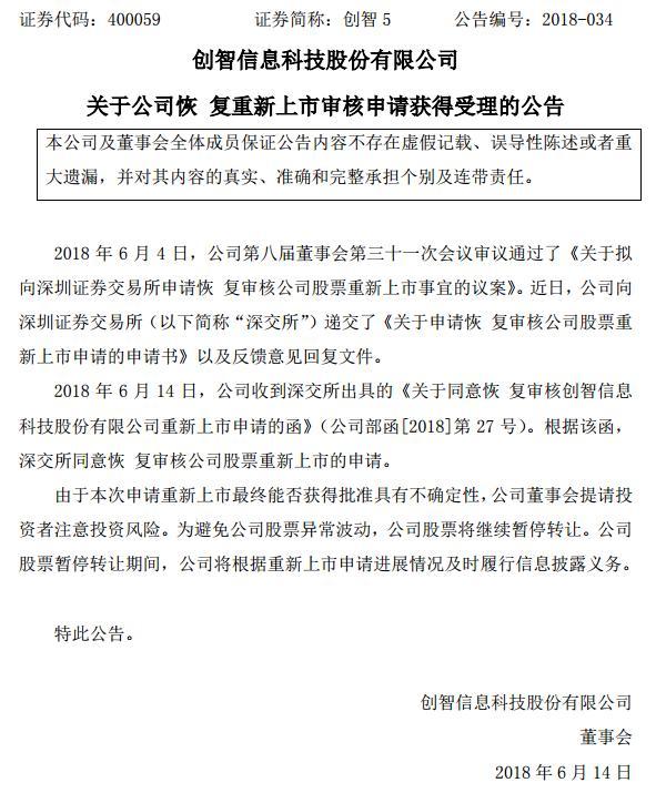 2018年6月14日,公司收到深交所出具的《关于同意恢复审核创智信息科技股份有限公司重新上市申请的函》(公司部函[2018]第27号)。根据该函,深交所同意恢复审核公司股票重新上市的申请。