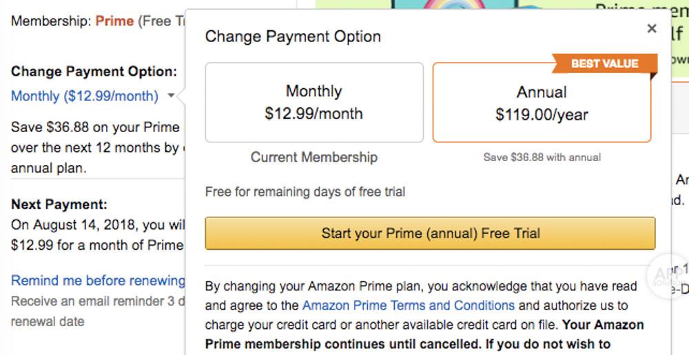 好在亚马逊还是很厚道的,并不会在取消这件事上难为人。依次点击「Account & Lists」、「Prime」,进入会员计划管理页,在这里你也可以更改付费计划,默认是按月付费(12.99 美元),直接付一年是 119 美元,价格会更划算。