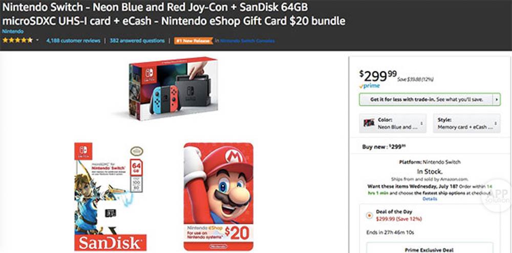 套餐组合价 299.99 美元,包括 Switch、闪迪 64GB SD卡、任天堂 eShop $20 礼品卡,性价比相当不错,「什么值得买」给出的未含税转运到手价预计是 2150 元,但还是那句话:转运被税的概率很高。