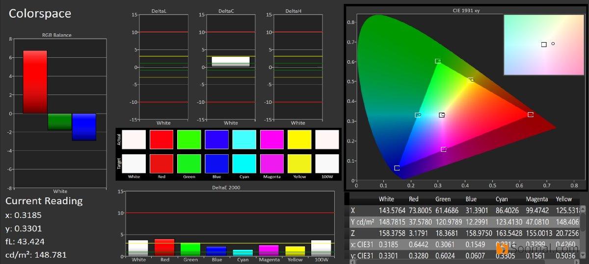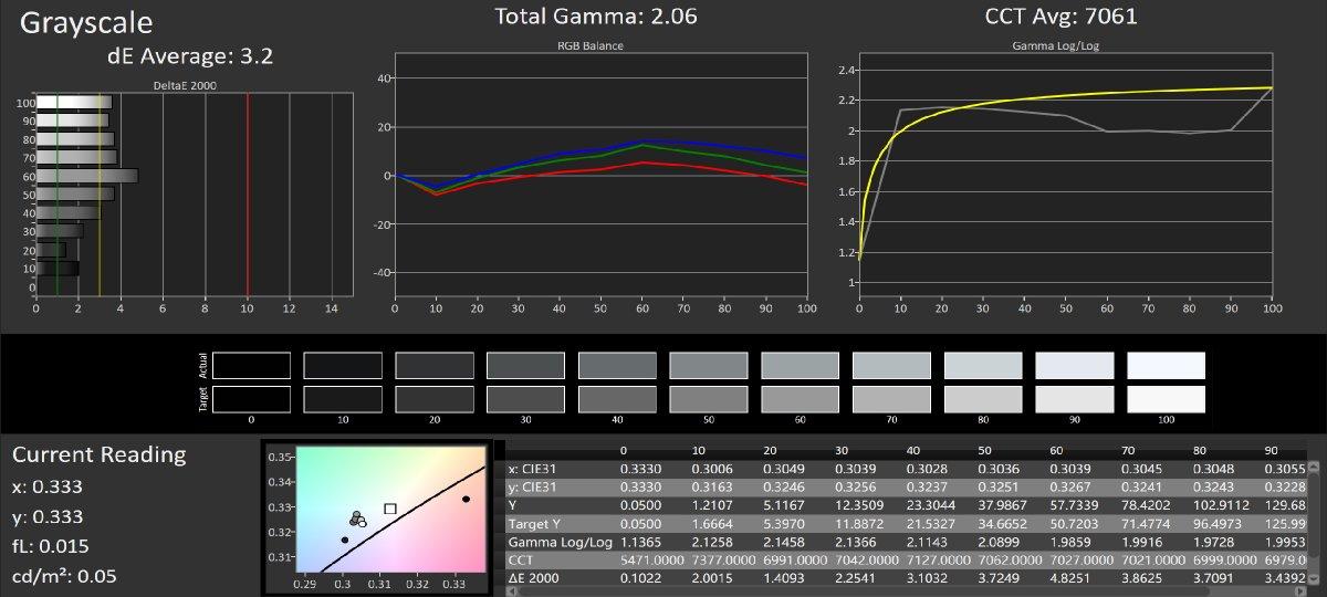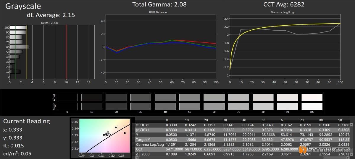 | 平均灰阶偏离,ΔE | 2.4 | 2.52 | 2.58 | 2.32 | 3.4 | 1.53 |