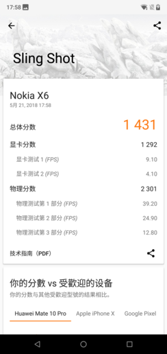 在3D Mark GPU图形性能中,NOKIA X6运行Sling Shot经典场景的得分为1431分,作为对比,骁龙625手机的成绩则仅仅刚超过800分。可以看出,NOKIA X6在图像性能上的提升非常明显。