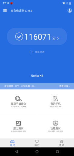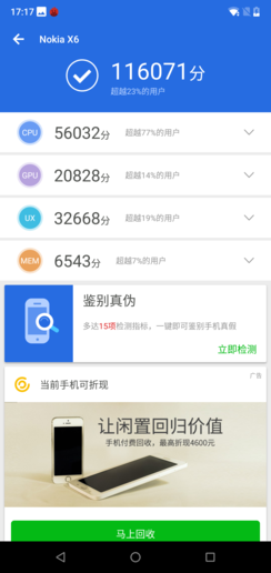 NOKIA X6的综合性能怎么样呢?我们用安兔兔综合性能评测对其进行了测试。NOKIA X6的整体跑分高达116071分,仅次于14万+的骁龙660,远超骁龙625/630。