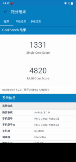 NOKIA X6处理器的性能提升有多大?我们用Geekbench 4对NOKIA X6进行了测试,结果显示骁龙636的单核跑分为1331分,多核跑分为4820分。其多核性能与三星Note 7、三星S7等曾经的旗舰手机相当,实力强劲。