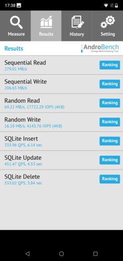 在AndroBench存储测试中,NOKIA X6的顺序读取速度可达279.01MB/s,顺序写入速度可达206.65MB/s,这个成绩与大多数采用高通骁龙636/660的手机(如vivo X21、OPPO R15等)基本相当。