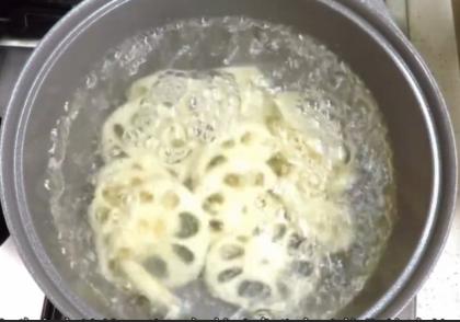 《沸水焯莲藕》准备一口干净的锅,往锅中倒入半锅清水大火烧开,在等水烧开的过程中,把莲藕清洗干净切成莲藕片备用。看到锅中的水煮沸之后把莲藕放入锅中焯水一分钟左右,这样能够使莲藕中的多芬氧化酶失去活性,从而抑制了多芬向醌转化的过程。