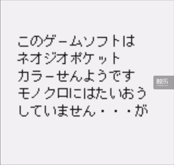 扯远了,让我们还是说回到有趣的报错画面本身。SNK紧随GBC之后推出的彩屏掌机Neo Geo Pocket Color也有同样的兼容问题,它的前辈黑白屏Neo Geo Pocket就完全不兼容彩色卡带。