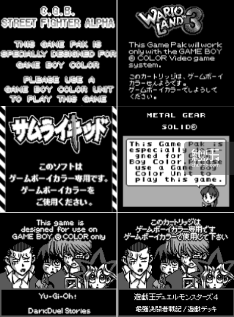 不过,像GB Light、GB Pocket以及Super Game Boy等就没有这样的卡子,所以插入GBC专用卡带开机的话,游戏就会显示报错画面。由于GB卡带容量并不是特别大,所以报错画面基本上都比较简单——一句话,最多加一张图了事。