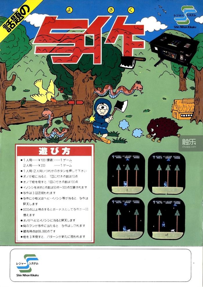 这款游戏名叫《与作》(Yosaku),是SNK 1979年街机游戏的重制版。《与作》在这几十年间虽然移植过Cassette Vision、X68000,也以《樵》(KIKORI)的名字重生登陆了iOS,但街机初代其实非常稀有:ROM没有Dump,基板本体更是完全没影,仅存的资料也少之又少。甚至连与SNK合作开发《SNK 40周年纪念合集》的Digital Ecplise都找不到这款游戏,转而在推特上发文寻求网友帮助。
