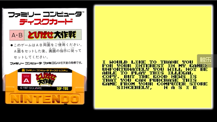 “非常感谢您中意我们的游戏,很抱歉您不能使用这份非法拷贝,但有个好消息是,您可以在附近的游戏店买下这款游戏。”落款中的“NASIR”是本作的伊朗裔程序员纳西尔·吉贝利,当年曾参加制作了《最终幻想》《圣剑传说》等名作