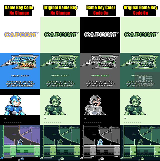 如果反过来,欺骗双向兼容的GBC卡带,让它们以为是插在GB上但实际是用GBC来运行,按理说应该会得到在GBC上玩GB卡带那样的画面,但实际上竟然也会出问题。