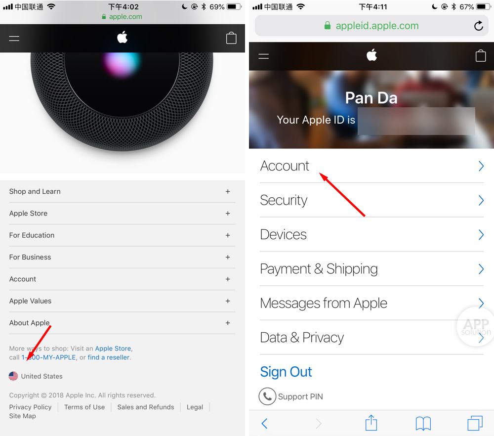 完成之后,会看到整个页面由中文变成英文。重新将页面拉到底部,选择「Account」-「Manage Your Apple ID」。打开新页面后,要关注看左下角的地区标示,如果仍为中国,则需重新点选换到 United States。