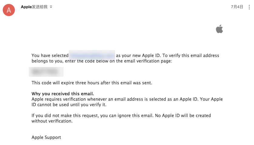 完成填写后点击下一步,这时苹果会向你的注册邮箱发送一封验证邮件,将验证码填入即可验证成功。