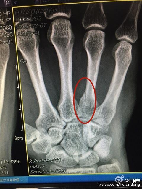 他受伤的伤情才不止这一点,另一张X光片明显看得出来有三根手指都做了固定处理。黑乎乎的阴影,看着也是让人毛骨悚然。