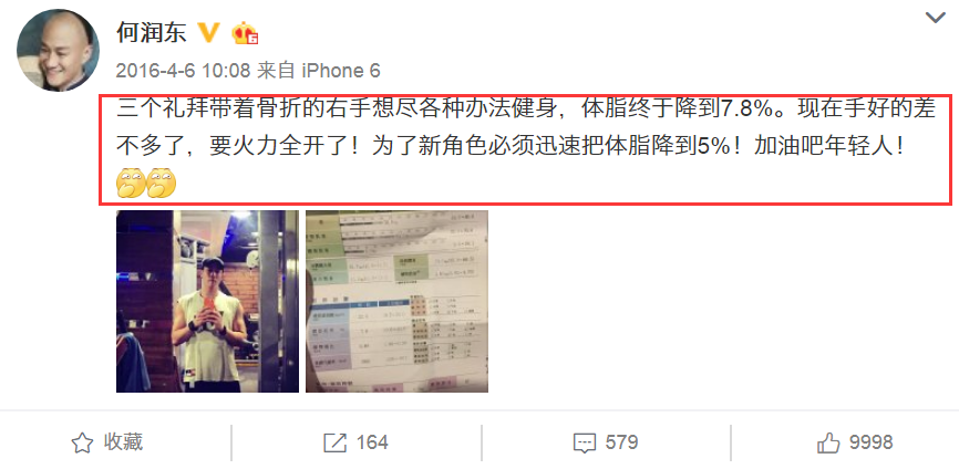 maybe也是为了正在拍的戏不得不锻炼,受伤前他就在狂练手臂肌肉,因为“导演说这个角色手臂要大”,实在太过敬业。