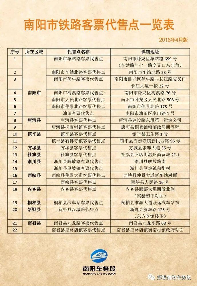 据了解,南阳车务段管内目前有23家火车票代售点,其中,平顶山地区1家,南阳地区22家,分布于11个县市区。市民前往购票时要关注。