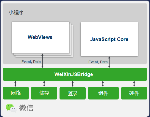 首先来看一下小程序的实现核心架构,如下图,第一层是小程序的渲染层,即 Webviews,主要负责;第二层是逻辑层,主要是通过业务逻辑实现登录功能和支付功能;第三层可以理解为微信原生的能力,微信将很多的丰富的原生客户端以及网络、储存、登录、组件和硬件等能力提供到了给了开发者,存储包括文件的读写、音视频的读写等,组件即开发常用的组件,包括音视频的录制,还有摄象头,还有拍照、扫码等等。