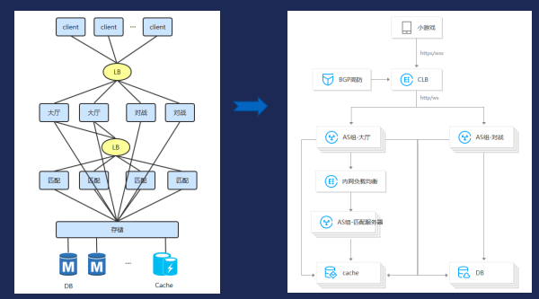 先来看下图(左)的无状态化分层架构,架构图如下图所示,简单说就是按照服务调用关系对节点进行分层,层和层之间由 LB(负载均衡)进行衔接,LB下的节点可以灵活的进行伸缩,这个架构其实就是常用的 web架构,应对一般的休闲类游戏也是够用的。