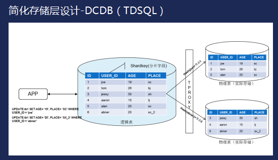 为了简化存储层的设计,现在比较广泛使用的是腾讯云的分布式数据库产品 DCDB,它的原理是通过增加中间代理层,将一个逻辑表映射到到多个物理表,将分片的复杂性完全封装在代理层。对业务层可以做到近乎透明。