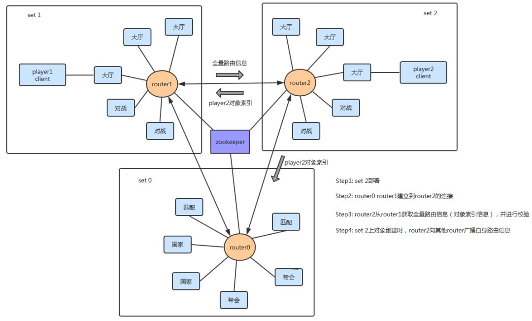 基于这个架构,系统的扩展可以在两个层面进行,一个是 set内的扩展,当大厅或者对战节点不够了时,可以动态添加,新节点会去 router上注册自己,加入到系统中,当一个 set的承载能力达到上限时,可以继续通过复制 set进行扩展,假设已经有了 set0和 set1,当需要添加 set2时,整个过是先部署 set2,当 router2起来时,router0和 router1会通过 zookeeper发现它,并建立到它的连接,连接建立后,router2会向 router1或 router0获取全量对象路由信息,并且将自己上面初始化后产生的对象路由信息发送给 router0和 router1。
