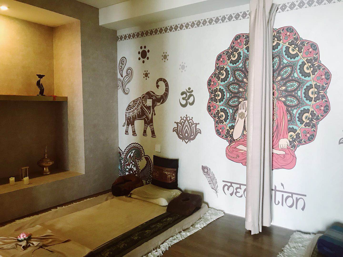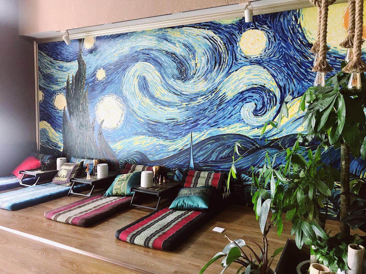 一进门,右手边是一副巨型梵高的《星空》,虽然不太明白这和泰式按摩馆有什么神秘的联系,但跟这些花花绿绿的萨瓦迪卡味儿并不违和。