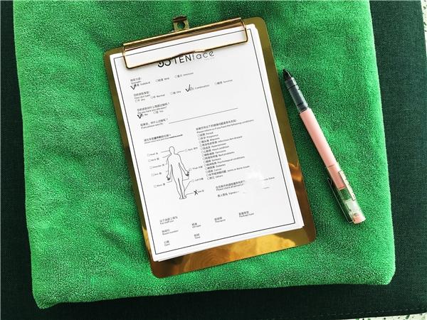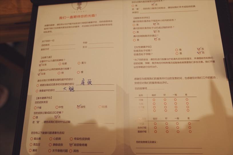 一张表填下来,你身体哪儿要使劲儿按,哪儿不能按,有没有特殊情况,自己什么肤质,清楚明白真切,师傅们照单开按,没有废话,没有过多的虚假寒暄。