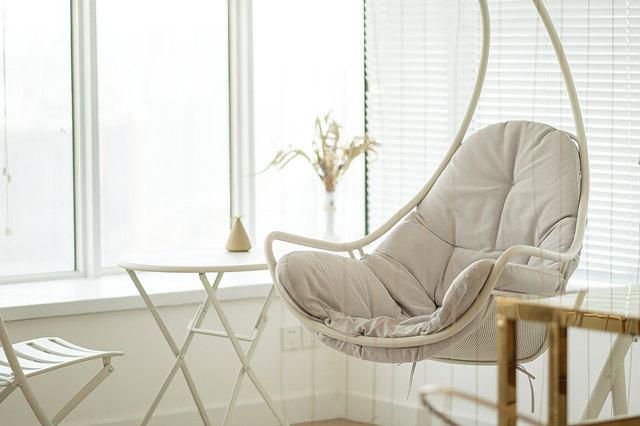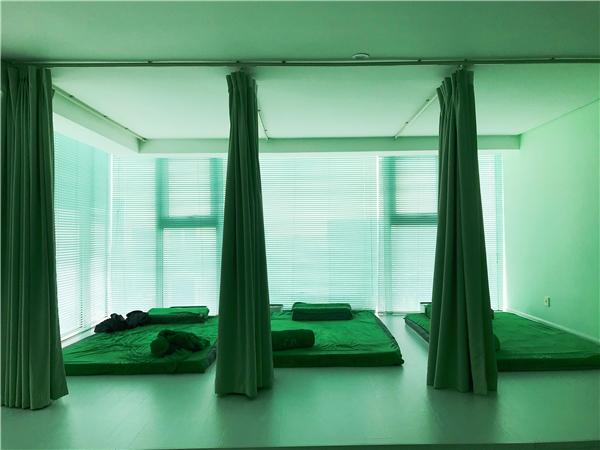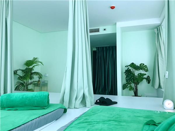 全身按摩的地方是在帘子背后,同样浅的绿色,白色百叶窗看起来也很新很干净整洁。角落里摆的几盆龟背竹之类的绿植也让人心情美好。