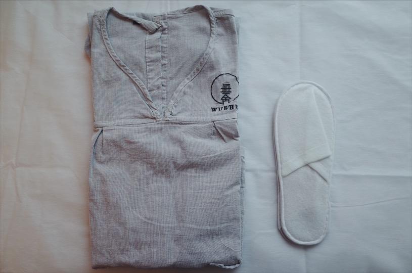 一个客人的标配是一个师傅,他们会把消毒好的衣服和拖鞋放在床上,然后跟你说,换好衣服按铃就可以。