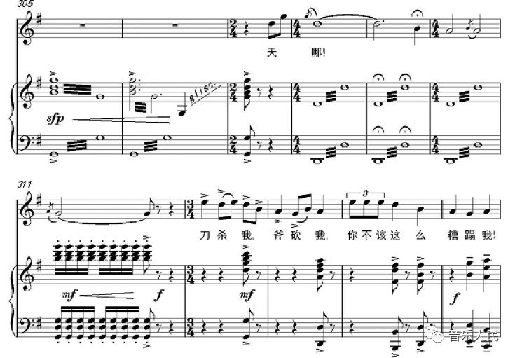 “刀杀我斧砍我,你不该这样糟蹋我”这句是“曲首冠音”。音乐采用戏曲垛板。演唱者必须具备戏曲基本功,把几个字,特别是“糟蹋我”三个字,用“喷口”喷出来,如此才能感染观众。我童年时演唱过山东梆子、河南豫剧,这些基本功派上了用场。采用演唱梆子的方法,把字咬住,用气息推出,效果极佳,很有感染力。