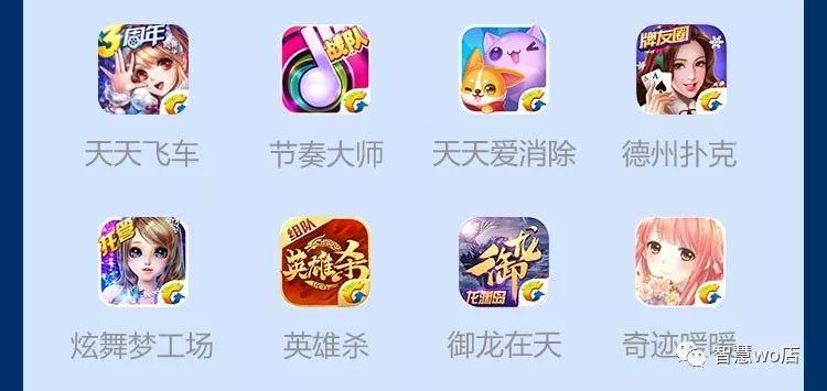 王者荣耀、穿越火线手游、QQ飞车、光荣使命、欢乐斗地主•腾讯、自由幻想手游、奇迹MU:觉醒、火影忍者手游、天天酷跑、QQ游戏、魂斗罗:归来、QQ降龙、掌上英雄联盟、英雄杀、御龙在天、奇迹暖暖、热血传奇、节奏大师、欢乐麻将全集、天天爱消除、全民飞机大战、QQ牧场、全民农场、全民水浒、全民闯天下、全民超神、全名枪王、天天德州、天天象棋、天天星连萌、天天来塔防、天天炫斗、天天富翁、天天风之旅、欢乐西游、欢乐王国、潮爆三国、九龙战、进击的女神、雷霆战机、勇者大冒险、脑力达人、拳皇98、蜀山传奇、糖果传奇、我叫MT2、驯龙战机3D、炫舞梦工厂、夜店之王、战争总动员、英雄无敌等其他腾讯系游戏。