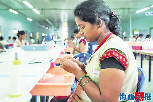 “当时,国内劳动力市场出现招工难、招工贵的情况,让企业经营压力重重。而印度不仅市场广阔,各类成本也很低。”姚明说,经过多番考察,位于印度安得拉邦维沙卡帕特南市的布兰迪克服装城最终被他选中。2013年年底,姚明织带着手筹备在印度建厂。2014年8月,占地4000多平方米,员工近500人的印度瑞蓓丝织带饰品有限公司正式投产运营。姚明织带成为福建出境加工业务的首个“吃螃蟹者”,从签合同到开业,仅用了8个月时间。可以说,姚明织带以独特的“厦门速度”,创造了布兰迪克工业园的多项“第一”。