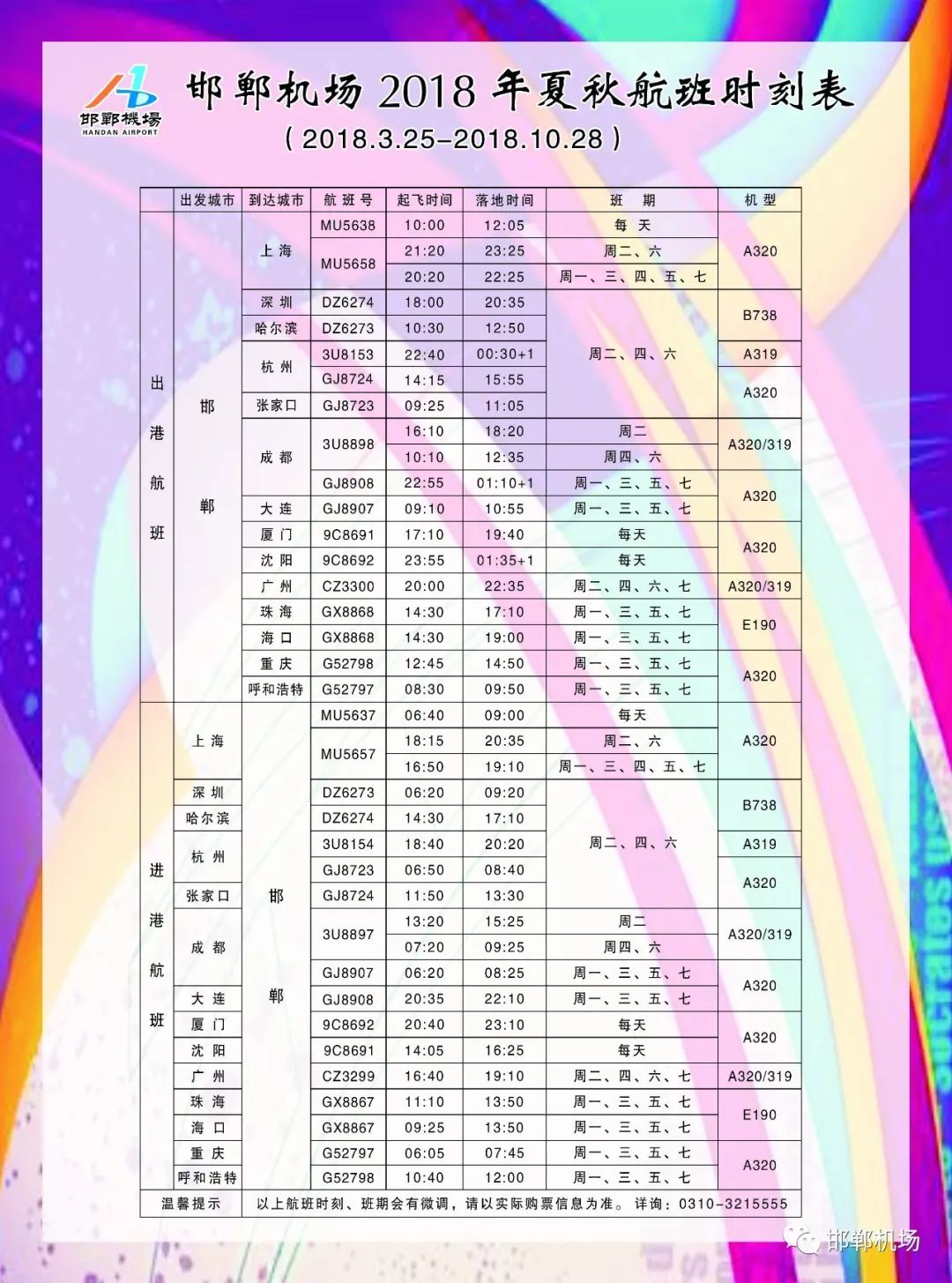 今日邯郸机场航班将正式执行夏秋航季时刻,邯郸机场航班有也有调整,一是厦门=邯郸=沈阳航线由每周4班加密为每天一班;二是深圳=邯郸=哈尔滨航线班期由每天一班,调整为每周2.4.6三班;三是从4月3日起,四川航空在每周2、4、6临时加班邯郸-杭州航班,加上浙江长龙航空公司执飞的邯郸-杭州航班,逢周2、4、6每天将有2班飞机从邯郸飞杭州。其它航线没有大的变化,只在时刻上有些调整,详情可咨询邯郸机场售票处热线0310-3215555。
