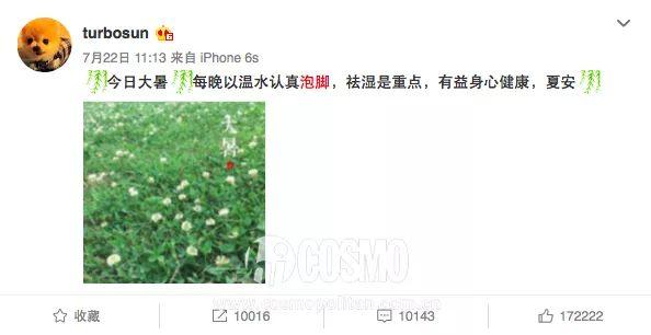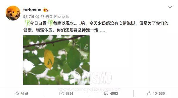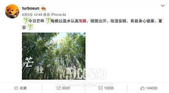 但说起泡脚养生,不得不提到的另一位明星必然是孙俪了。打开娘娘的微博,搜索关键词“泡脚”,就会看到一连串的在每个节气时她提醒大家泡脚的温馨提示——