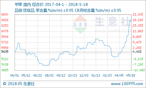 根据生意社监测的样本价格来看,本周甲苯综合价格上涨。截止5月18日,甲苯的综合价格为6455元/吨,较本周初5月14日报价6378元/吨,报价上涨77元/吨,涨幅1.22%。较去年同期,同比上涨19.84%。