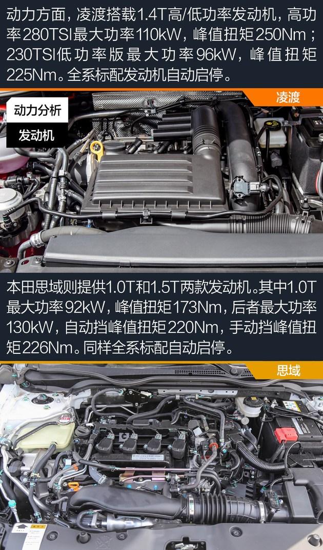 大众凌渡和本田思域均采用了涡轮增压发动机,并提供两种动力选择。传动方面,除了手动选择外,凌渡匹配7速双离合变速箱,思域则是CVT无级变速箱。同时,两款车型均全系标配发动机自动启停功能,值得称赞。