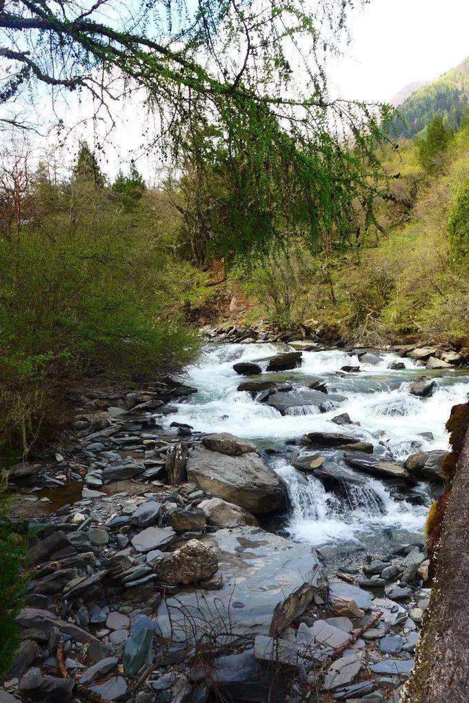 沿着人参果坪的小溪漫步,放眼坦荡妩媚的草地,这里山水相依、草木相间、云遮雾绕,透过沙棘树沿溪流回望,云雾笼罩的青山、沙棘树丛、潺潺溪水和牦牛构成了一幅和谐画卷。