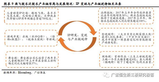 与孩之宝十分相似,经过20多年的发展,奥飞娱乐目前已经积累并打造了众多知名IP并构建了以IP为核心,集漫画、动画、连续剧、电影、游戏、媒体、玩具、婴童、授权、主题公园等于一体的泛娱乐生态系统。泛娱乐产业链布局的好处在于:(1)前期投入优质的IP资源可进行多方位的变现,通过开发为动画、电视剧、网络剧、电影、游戏、主题公园等文化内容和消费场景可提升和放大IP品牌价值,同时多渠道联动变现模式可提升单个用户价值;(2)通过电视频道、互联网平台等媒体的运营可对文化内容进行快速的品牌化传播从而快速扩大IP影响力,是IP运营中的重要环节。