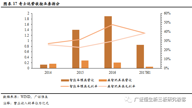 奇士达的玩具销售主要包括车模与益智玩具,作为车模玩具领域的头部企业之一,奇士达取得多家汽车品牌的IP授权;而在益智玩具方面,公司也取得了托马斯、风火轮以及海绵宝宝、倒霉熊等著名动漫经典IP形象的授权。从奇士达的业务拆分来看,其营收主要来源于智能车模类,且智能车模类的毛利率较高;2016年智能车模类营收增幅达35.46%,而益智玩具类销售收入同比下降695万,主要原因是在公司产能受限的情况下被动放弃部分盈利能力相对较低的益智玩具订单所致。