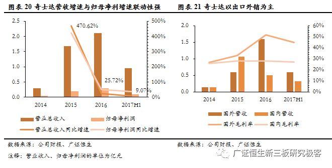 在具备了相应的核心竞争力之后,奇士达突围而出,迎来了业绩的释放期。从奇士达的营收增速来看,2015年由于香港子公司收入并表而使得营收在当年出现了将近500%的增幅,而在近两年,奇士达的营收增速平稳向上,且营收增速与归母净利润增速十分贴近,关联度大,盈利质量较高;从营收分布来看,奇士达的营收以出口外销为主,且出口外销的营收呈现逐年较快增长的趋势,而国内销售的营收在2016年度出现较大的下滑,主要是在短期内公司产能一定的背景下,公司以毛利率较高、回款较快的出口外销业务为主,而且公司在国外拥有比较强大的销售渠道。